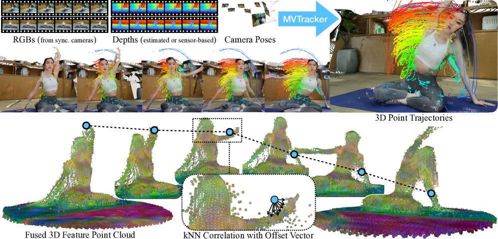 Multi-Camera 3D Point Tracking — MVTracker fuses multi-view features into unified 3D point clouds using transformer refinement, tracking arbitrary points across cameras without per-sequence optimization