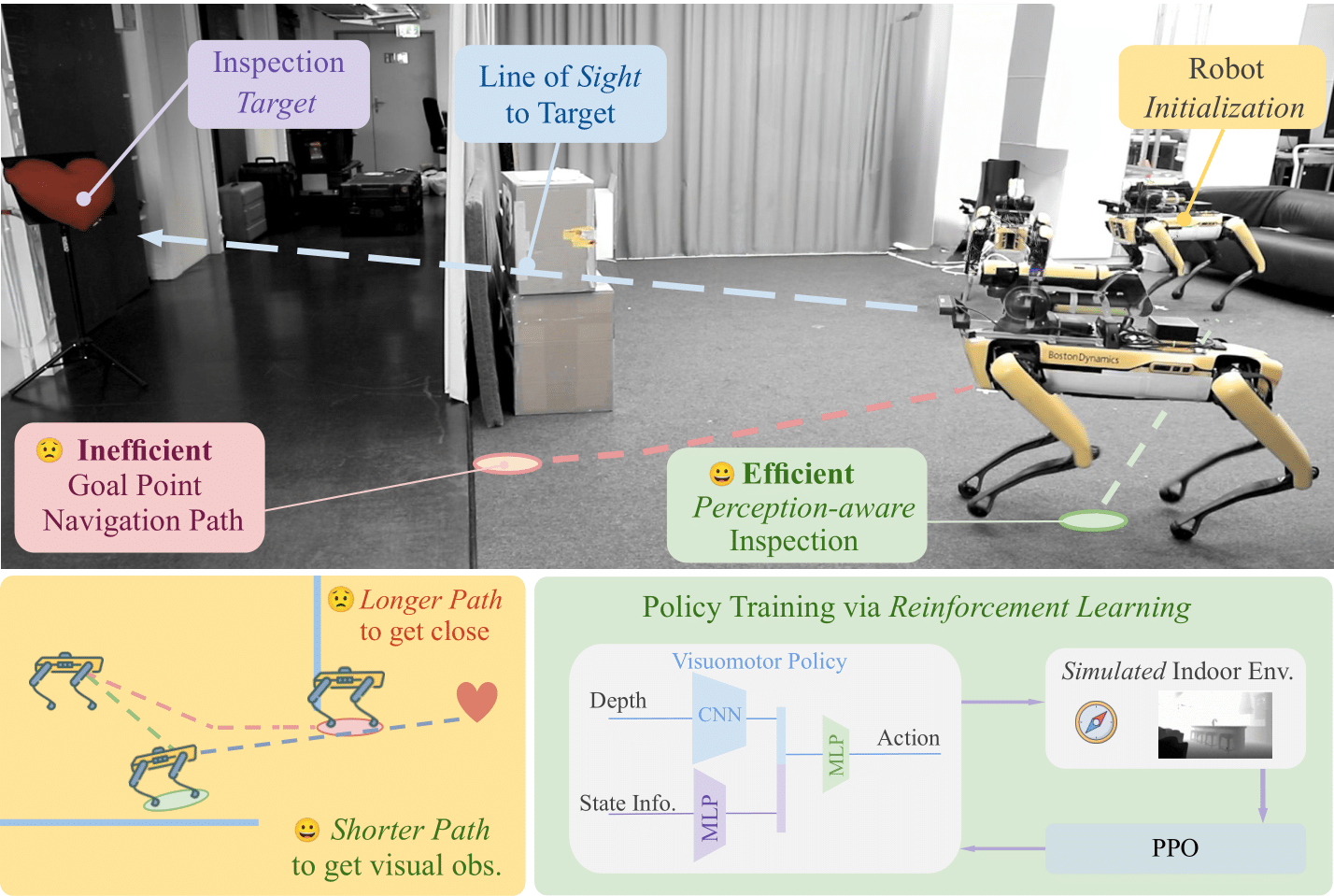 Perception-Aware Robot Inspection — RL framework optimizes for target visibility rather than proximity, finding shorter paths than navigation methods and transferring successfully to Boston Dynamics Spot